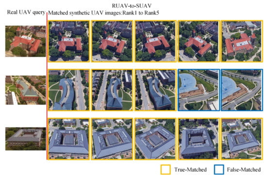 Figure 10 shows the matching results of RUAV-to-SUAV. When real UAV-view images are used as the query, the LCM can accurately match the images of the same location in the synthetic UAV-view gallery. This result not only shows that the LCM is effective in the feature expression of the real UAV-view images but also shows that the synthetic UAV-view images in University-1652 are close to the real scenes.