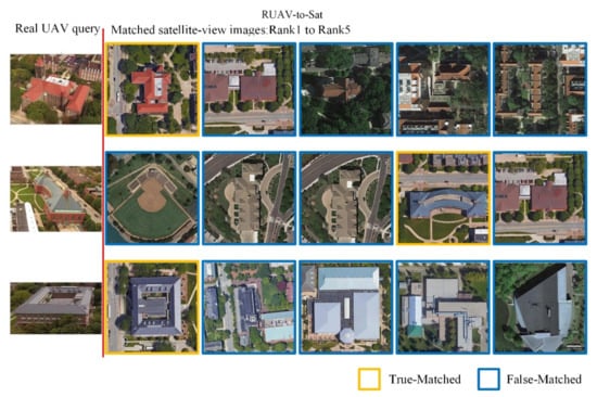 The matching results of RUAV-to-Sat are shown in Figure 11. The performance of the experimental results is consistent with the one in which we use the synthetic UAV-view image as a query to match the satellite-view image. The LCM can successfully match the real UAV-view images with the satellite-view images. The false-matched satellite-view image and the true-matched satellite-view image have similar structural and color features. It further shows that the LCM trained based on the synthetic UAV-view images also has a good matching performance in the real images.