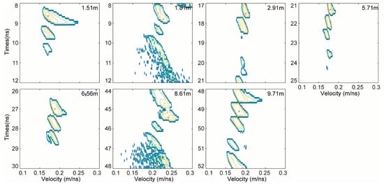 The semblance analysis contour of diffraction hyperbolas for the LPR CH-2B data was based on the rock location extraction by applying the local correlation, and the results are shown in Figure 7. The red-cross in the contour maps represents the maximum value of the semblance analysis. The stacking velocity for the rocks was obtained by picking the maximum value of the semblance analysis, and the calculated depths are listed in Table 2.