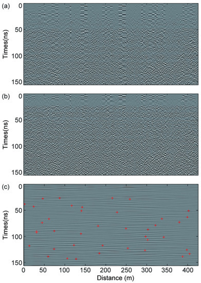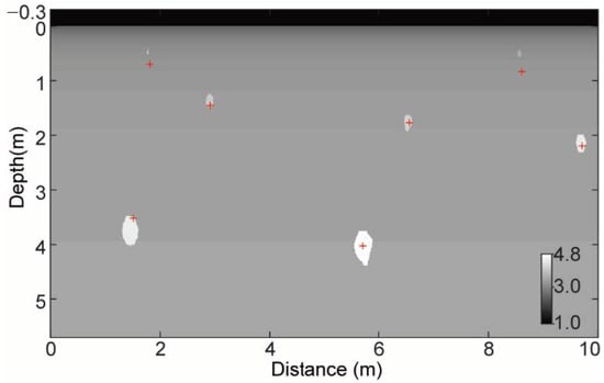 We verify the effectiveness of the proposed method in a synthetic model using the finite difference time domain (FDTD) method [29], as shown in Figure 3a. The synthetic model consists of a heterogeneous background and several anomalous rocks with random relative permittivities less than 5.0 [24]. The dominant frequency of a Ricker wavelet is 500 MHz, the time windows and the sampling interval are 120 and 0.02 ns, respectively, and the trace interval is 0.005 m.