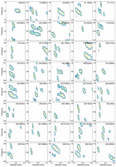 where L is 11,661 in LPR data, i and j are time sample indices, k is a trace number and is the amplitude of the j-th sample of the k-th trace [27]. The selection of M would not influence the peak location of contours for semblance analysis. A proper selection of M would gain a better tradeoff between resolution (traveltime and velocity) and noise compression. Our sensitivity analysis indicates that a value of M = 3 would give a reasonable resolution and less noise level, so here we set M = 3.