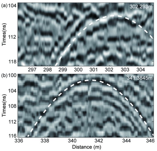 Meanwhile, we compared the diffraction hyperbola for No.30 and No.34 rocks with the CH-2B data. As shown in Figure 8, the white dotted lines represent the diffraction hyperbola at 302.2930 m and 106.5625 ns for the stacking velocity of 0.142 m/ns (Figure 8a) and at 341.3845 m and 101.5625 ns for the stacking velocity of 0.165 m/ns (Figure 8b), respectively. The trend of the hyperbola shows great consistency with the CH-2B data, which indicates the semblance analysis procedure can obtain the stacking velocity with high precision.