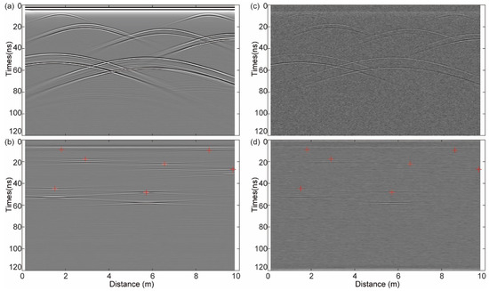 The amplitude of echoes in the first ~150 ns (length N = 501 with 0.3125 ns time interval), with a depth of about 10 m for the LPR CH-2A and CH-2B data, is displayed in Figure 6a,b, respectively. The local correlation for the filtered CH-2A and CH-2B data is shown in Figure 6c, where the red-cross indicates the vertex position of the diffractions after selection.