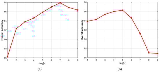 Classification accuracies of the proposed MASEMAP-MKL method as a function of parameter : (a) IP; (b) UP.