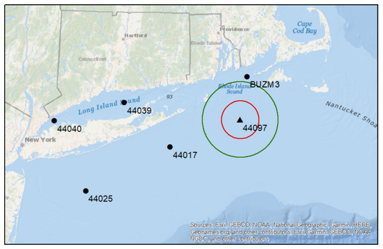 Locations of buoy sensors measuring wind speed and , as well as the BUZM3 wind tower station. Data are displayed in a coordinate system in which units are in degrees, and where degrees are represented as equally spaced over the x and y scale. The red bound and green bound represent 0.25 and 0.5 decimal degree radii from a buoy. Buoys are displayed either as a circle or triangle to show whether they are within or outside of 50 km from land, respectively.