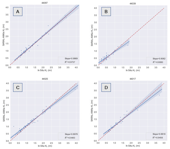 Comparison of significant wave height, , between SARAL/AltiKa and selected buoys at stations 44097 (A), 44039 (B), 44025 (C), and 44017 (D). Matched measurements denoted as blue dots are those falling within radius . In each case, the fitting linear regression line is shown as a continuous blue line with their corresponding 99% confidence interval in shaded blue.