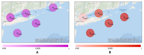 Consistency is also sought through the calculation of the time correlation of the matched measurements. The correlation for each site is shown in Figure 6. The Pearson correlation for the wind speed is shown in Figure 6A, with correlations equal to or higher than 0.90. Table 2 lists the Pearson correlation coefficient and corresponding p-value, the coefficient of determination and the root mean squared error (RMSE). The figure reveals that the estimation of the wind speed is insensitive to whether the station is located inside or outside of the Long Island Sound. Figure 6B shows the Pearson correlation coefficient for . It shows contrast in correlation values with higher values for locations in the open ocean. Table 3 provides additional performance measures.