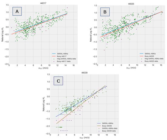 To perform the comparison, a polynomial regression curve is obtained for the two datasets and displayed as the natural logarithm of . We compare the aforementioned relationship between the satellite and buoy measurements for Station 44017, 44025 and 44039 as they have sufficiently large sample size. The buoy wind– regression cannot be computed for Buoy 44097 and Station BUZM3 as they measure only one of the two variables. The relationship for Station 44040 is omitted due to the short sample size, as described above.