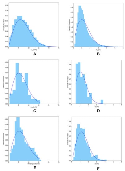 Probability density functions of (left) and (right) for Buoy 44017 for the period 2014–2019: (A,B) PDFs based on all the in situ data available for the period; (C,D) PDFs for the space and time matched cases of in situ observations; and (E,F) PDFs for all the matched AltiKa measurements. The fitting Weibull distribution curves defined in Table 5 are also shown.