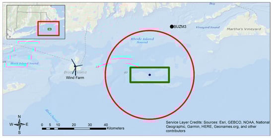 Map of locations of BUZM3 station, wind farm and target area (green rectangle). The red circle represents of the center of the target area.