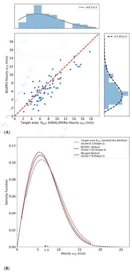 The closest wind station is the BUZM3. The AltiKa data passing over this site, however, have a bias, as evident in Figure 4D. The bias is 1.1661 m/s with AltiKa data showing systematically lower values than those from the in situ observations. This bias is corrected to create a new distribution that is combined with the AltiKa data overpassing the target area to create a merged Weibull distribution, as shown in Figure 10. Figure 10A shows the scatter plot and the marginal histograms with fitted Weibull distributions of on the target area and on the BUZM3 station. The merged Weibull distribution is shown in Figure 10B.