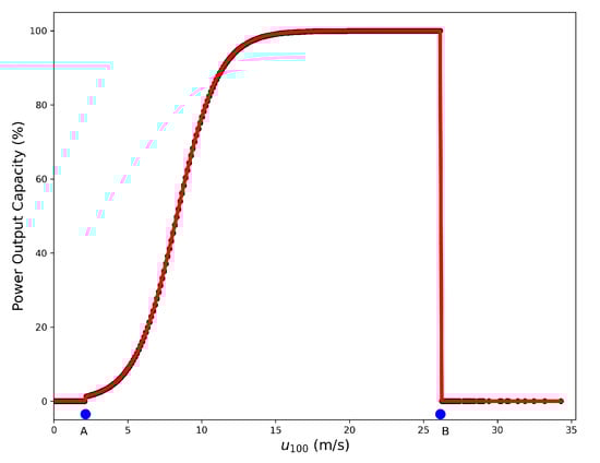 Wind power generation depends on the design of the wind turbine and the wind flowing across its axis plane. Every wind turbine has a characteristic power performance curve that relates the energy production to the hub-height wind speed. The (power) curves summarize the technical details of the wind turbine’s components such as wind turbine rotors and electrical generators [36], and are normally provided by the manufacturer. Due to its proximity to the target area—the green box in Figure 9—in this study, the power curve of the wind farm located at the Block Island site is used. The parameters in this curve were the hub-height (100 m), the rated power (16 MW) and the cut in and cut off wind speeds of 2.1 and 26.1 m/s, respectively. The 10-m wind distribution obtained in the previous section is extrapolated to 100 m using the recommended Power Law vertical wind shear model [37]. Furthermore, experience with the time series of power generation and corresponding wind speeds of the wind farm indicates that the power curve can be modeled using the wind distribution quantiles [38], as shown in Equation (3).