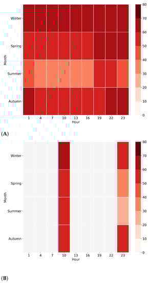 Seasonality and diurnal characteristics of power output capacity in percent. Power output capacity are averaged by month and hour. (A) Merged data. Approximate observations per cell: 500. (B) Target area SARAL/AltiKa. Approximate observations per cell: 10.