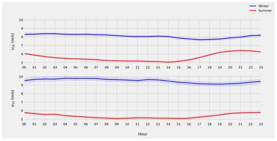 Figure 13 shows that the amplitude of the wind speed diurnal cycle is stronger during the summer months, especially in stations near the coast. This is consistent with the expected land–sea breeze mechanism resulted from the unequal heating rates of land and water.