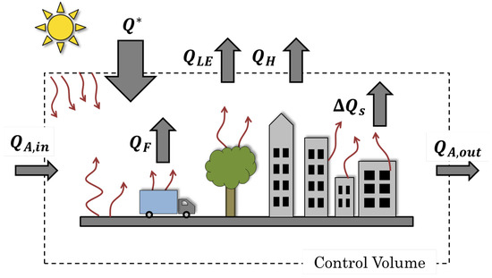 The surface energy balance (SEB) is often presented as the starting point for numerical weather models and meteorological observation studies interested in quantifying energetic processes within a given volumetric layer [4,63]. Figure 2 shows the balance of energetic components found in a typical urban control volume. The net all-wave radiation (), sensible heat flux (), latent heat flux (), and storage heat flux () are all included in the traditional surface energy balance, while the anthropogenic heat flux (), advective heat flux (), and other sources and sinks (S) are incorporated depending on their significance to a given application. The resulting surface energy balance for urban areas can be written as [64]: