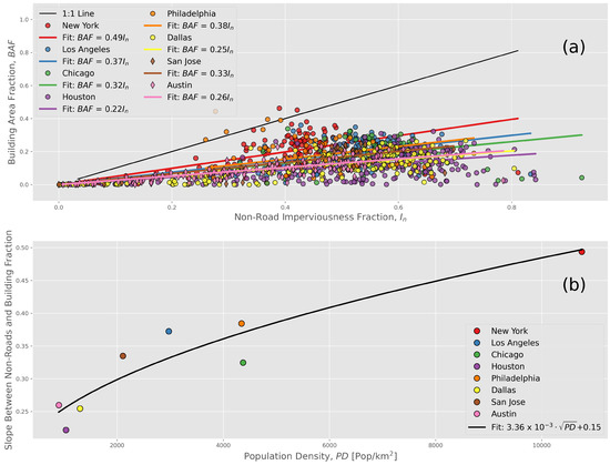 The fraction of buildings present in each satellite pixel was determined by first collecting building databases for eight out of eleven of the largest U.S. cities by population: New York, Los Angeles, Chicago, Houston, Philadelphia, Dallas, San Jose, and Austin. Three of the eleven were omitted due to lack of publicly available data. Figure 3a shows the relationship between building area fraction and non-road imperviousness land cover fraction. The points above the 1:1 line likely represent situations where the city developed buildings within the four years since the development of the NLCD 2016 product. A modest correlation exists between the square-root of population density and the slope between non-road imperviousness and building area fraction. This relationship can be written as follows: