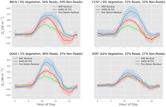 One of the implications of the results presented here is the interpretation of current frameworks to estimate . Observations from eddy covariance methods show that the residual term, often used to represents , is very high compared to the WRF residual method. Our results show that the thermal variability scheme estimate of is within 60–70% of the residual term computed from the flux tower. This is partially due to the tuning of parameters in the diurnal comparison of values between satellite TVS, uWRF residual, and flux tower residual. There is a possibility that advection is a more prominent term in the Urban SEB than previously believedand that the lower TVS values may be further indication of such phenomena [93]. Furthermore, there is also a possibility that eddy covariance systems are incapable of capturing all energy-containing eddies in urban environments. The residual term is uniformly high at all three urban sites, as shown in Figure 4. Interestingly, in the least urban of the four sites, Staten Island (STAT) where the flux tower is located in a suburban environment with 42% vegetation cover, the values estimated by the TVS method match reasonably well with the residual term and numerical model. This bolsters the hypothesis that caution should be taken when representing as the residual term in the surface energy balance for highly urbanized sites. Previous studies that have elaborately used the residual strategy for determining may, in fact, be overestimating the storage heat term in urban areas. On the other hand, the numerical model exhibits lower values when compared to the satellite method, which may be related to the lack of parameterization for storage heat flux in the urban canopy models. Many researchers in the past have observed larger amplitudes in sensible heat flux predicted by numerical models in urban areas, resulting in a residual term with a lower amplitude. Urban canopy models are designed based on traditional land surface models created for non-urban environments, where the available energy is partitioned between sensible and latent heat fluxes that are dependent on soil properties and vegetation type [94,95]. This is true even for the urban WRF model presented as a comparison here. However, this binary mode appears deficient in urban areas as the contribution to latent heat flux is weak in highly urbanized environments, resulting in the over-prediction of sensible heat.