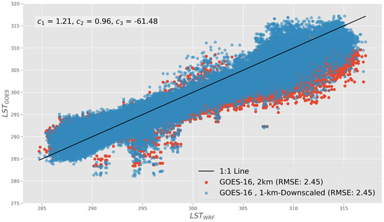 Figure 5 shows the performance improvement after downscaling LST from the GOES-16 satellite to the 1-km WRF resolution. It is important to note that the coefficients were found for a WRF run from 9 to 12 August 2019, while the data in Figure 5 were independently tested for those coefficients with a WRF run from 29 August to 1 September 2019. Furthermore, similar errors were presented by Bechtel et al. [84] for an urban study in Hamburg, Germany, where LST from the Spinning Enhanced Visible and Infrared Imager (SEVIRI) was downscaled from 1 km to 300 m using the Advanced Spaceborne Thermal Emission and Reflection Radiometer (ASTER).