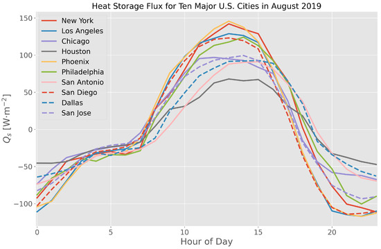 Mean diurnal heat storage flux for August 2019 across all ten major U.S. cities using the satellite-derived thermal variability scheme (TVS).