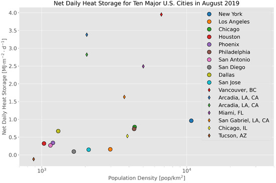 Heat storage is computed across the ten largest U.S. cities by population for the month of August 2019. Figure 7 shows the diurnal behavior of each city’s heat storage based on the satellite-derived thermal variability scheme (TVS). Upon integration of the amplitudes over the 24-h diurnal profile, an approximate value for daily heat storage flux for summertime can be found. This was done as a way of comparing the values with observations and models in the literature, as shown in Figure 8, where population density is plotted as a function of daily net heat storage. The range of values for suburban and urban areas can be found to fall between roughly −0.1 and 4.0 MJmday, which bookends the range observed in our analysis for August 2019 [1,9,85].
