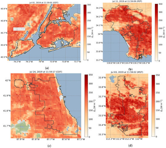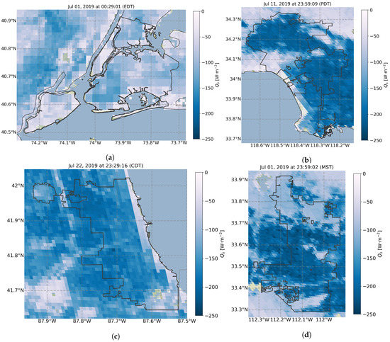 Figure 9 shows near-peak daytime heat storage from July 2019 plotted for four different cities: New York, Los Angeles, Phoenix, and Dallas. The cities were chosen in an attempt to diversify the urban microclimates without needing to produce individual plots for each of the ten cities referenced in Figure 7. New York was chosen for its humid subtropical climate, Los Angeles for its Mediterranean climate, Chicago for its continental climate, and Phoenix for its hot desert climate [89,90].