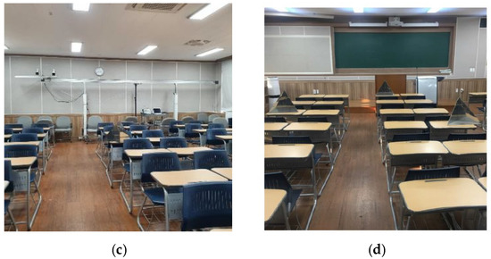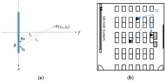 A bistatic ground-based synthetic aperture radar (GB-SAR) experiment inside a lecture room with (a) a schematic geometry, (b) a diagram of the indoor targets and system, (c) a photo of the system and the targets, and (d) a photo of the lecture room seen from the system with chairs and three trihedral corner reflectors (CR).