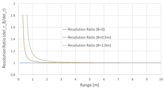 The bistatic range resolution is always poorer than that of monostatic case [14], and converges to the monostatic case if or at far range where B/r becomes negligibly small, as shown in Figure 2. Note that this degraded range resolution effect of the bistatic configuration occurs at the very near range only and becomes less than 103% of a monostatic case at a range of R = 2 m with m. This effect would be negligible for airborne and satellite SAR operations when B/r is relatively small.