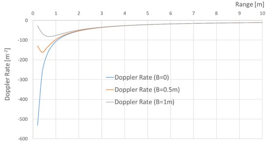 If , , which is the same with the monostatic case in [10]. Figure 3 shows Doppler rate versus range with various B values. The value deviates from the monostatic case (B = 0) especially at near range, which means the cancellation of the higher term in (11) would be inappropriate and causes image degradation at the near range for RDA. However, the bistatic Doppler rate approaches 97% of the monostatic case at r = 4 m and the image degradation becomes negligible at far range. This effect can be seen in the experimental results in the next section.