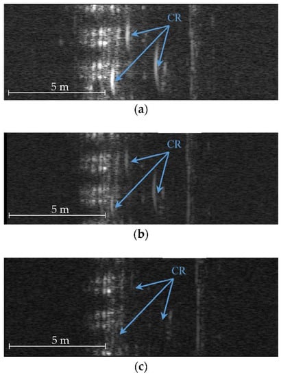Range-compressed images for (a) B = 0.27 m, (b) 0.5 m, and (c) 1 m. Note: trihedral corner reflector signals (CR) are completely lost when B = 1 m.