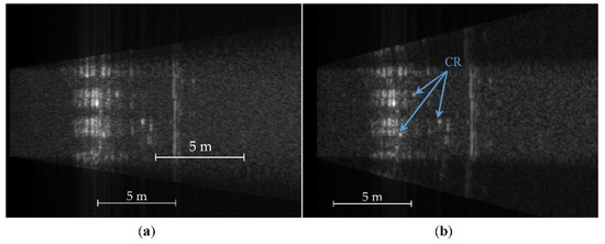 Bistatic GB-SAR focused image by (a) range-Doppler algorithm (RDA) and (b) back-projection algorithm (BPA) for B = 0.27 m. CR represents trihedral corner reflector.