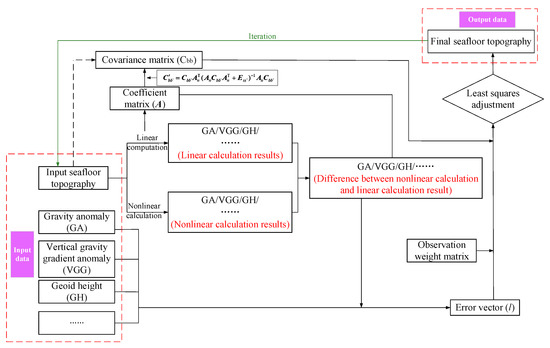 Flow chart of the seafloor topography inversion process by the nonlinear iterative least-squares method.