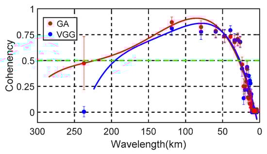 The average sea depth is 4702.02 m (SD = 783.46 m), while the minimum sea depth is 6971.99 m. These values suggest that the study area’s terrain fluctuates sharply and that improper search equipment selection may result in large losses (some search equipment have to be near the seabed during detection). The mean GA is 28 mGal (SD = 43 mGal), while the mean VGG is −1.5 Eotvos (SD = 38 Eotvos). The discrete control points are placed into a 1′× 1′ sea depth grid using the Generic Mapping Tools (GMT). Using the gridded VGG/GA results, and ST as input data, the coherence in waveband information between the input data was obtained through coherence analysis technology [25]. The results are shown in Figure 5, where the red points show the GA and ST wavelength consistency, while the blue points present the VGG and ST wavelength consistency. Fourth-degree polynomial regression was then used to obtain the fitting relation between wavelength and coherence for the two sets.