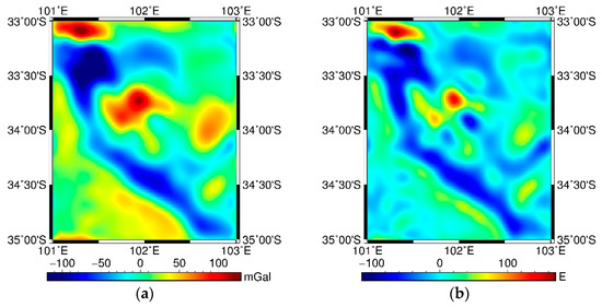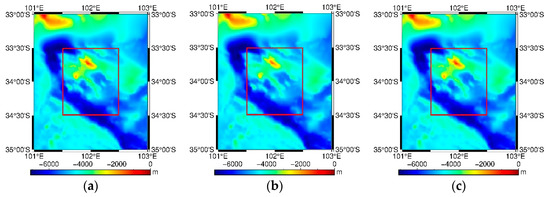 A reasonable integration radius needs to be set to calculate the VGG/GA using the terrain prism integration method. Based on the recommendations of previous studies [20,21], we selected 30′ as the integration radius. The actual input range of the sea surface VGG/GA data in the inversion process was (, ). Due to the influence of the edge effect, the effective range of the final ST model was reduced by 30′ compared to the initial input range, i.e., (, ). To implement the inversion method smoothly, the variance of the input data (i.e., SM, GA, and VGG) must be obtained. For the accuracy evaluation of the SM data, using the third-class survey accuracy in the S-44 (fourth) hydrographic survey standards, when the average depth of the study area is 4702.02 m, the SM accuracy (mean square deviation) is 108.15 m. Given the satellite altimetry GA accuracy of about 2–5 mGal [24,35], the GA accuracy was set to 3 mGal. The accuracy of the VGG derived from the altimetry datasets was not reported. Thus, based on previous research, the accuracy of VGG was set to 15 Eotvos.