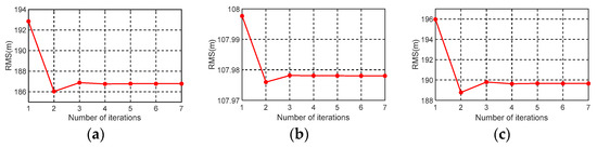 RMS of the bathymetric model (BAT) derived from gravity data varies with iterations: (a) GA; (b) VGG; (c) GA + VGG.