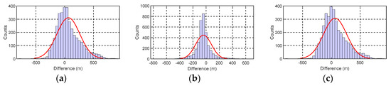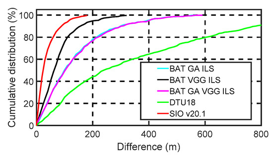 The statistical summary of differences within the different ranges is shown in Figure 15. Assuming that the strict regulation of the normal distribution is ignored, the normal distribution of the histogram is analyzed, and the difference distribution curve is generated for each model (shown in red line). The results show that most of the disparities are kept within 200 m. For BAT_GA_ILS and BAT_GA_VGG_ILS, 86% of the deviations with SIO V20.1 are within 300 m. For BAT_VGG_ILS, 90% of the difference with SIO V20.1 is less than 200 m.
