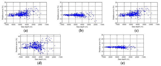 Relationship between relative error and sea depth. (a) BAT_GA_ILS; (b) BAT_VGG_ILS; (c) BAT_GA_VGG_ILS; (d) DTU18; (e) SIO V20.1.