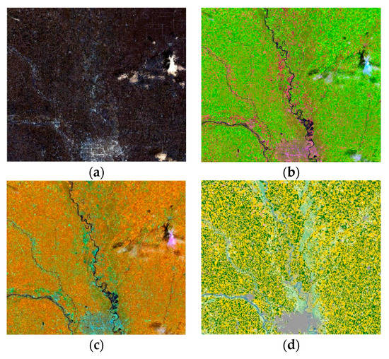 Part of the training data produced: (a) 432 band fusion image; (b) 652 band fusion map; (c) 564 band fusion map; (d) corresponding CDL data. (a–c) are obtained by Landsat 8 satellite on 7 August 2019.