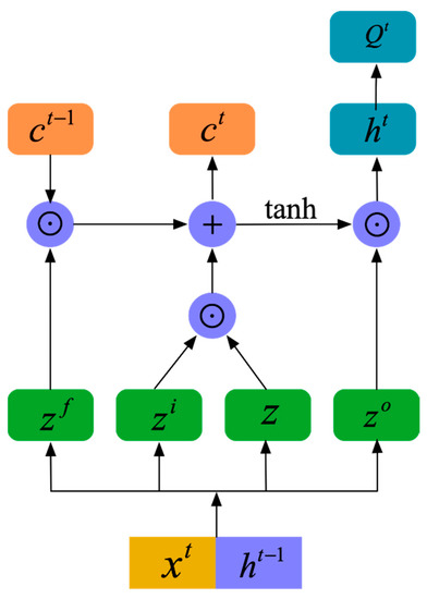 The RNN takes sequence data as input, recursively in the direction of the sequence, and all nodes are connected in a chain [13]. That is, the output of the neuron at time t-1 will be the input of the neuron at time t together with the next input. Unlike traditional neural network models, RNN can take advantage of the time dependence of data. As a variant of RNN, LSTM solves the problem of gradient disappearance and gradient explosion when using RNN to build a deeper network. Equations (1)–(7) and Figure 5 show the internal computation of the LSTM unit. stands for the Hadamard product, which multiplies the elements in two homotype matrices correspondingly. The input of LSTM is sequence variables , where is the feature vector and is the corresponding timestamp. The in the formula represents the result of the splicing between the input at time and the passed from the previous state.