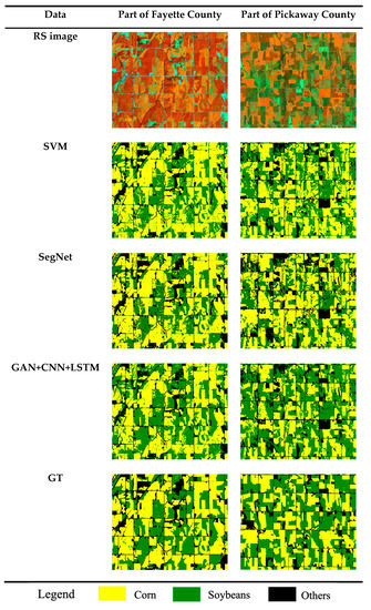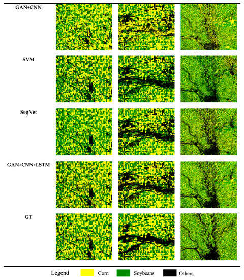To verify the ability of our method in dealing with the classification problem when the input data are time-series remote sensing images, we use Landsat8′s 564 combination band images with three time-terms on July 22, August 7, and September 24 of 2019 to form series data. To maintain the consistency, the data generated by the GAN model are also in series in this experiment. In addition, we put together seven different models for comparison. The experimental results are shown in Table 2. The order of these models in performance effects is: LSTM < CNN < CNN + LSTM < GAN + CNN < SVM < SegNet < GAN + CNN + LSTM. The experiment testing the first four models can be regarded as ablation analysis. SVM and SegNet are two state of the art models at present. Our method (GAN+CNN+LSTM) achieves the highest Kappa coefficient (0.7933) and OA accuracy (0.86). It is worth noting that all models can achieve more than 85% accuracy in the classification of corn, but this is difficult for soybeans and other categories, which range mainly from 60% to 80%. The results of the first two models show that it is not enough to use only spatial features or temporal features when completing this classification task. The result of the model CNN+LSTM proves the effectiveness of combining the spatial and temporal features. Interestingly, the result of model GAN+CNN reflects the excellent ability of GAN in completing classification tasks. We consider that this is not only due to the fact that the discriminator itself is a CNN model, but the generation training process helps the model to use more false samples in the training process. The Kappa coefficient of both SVM and SegNet is above 0.7, showing the strong competitiveness. Compared to SegNet, our model improved by 3 percentage points.