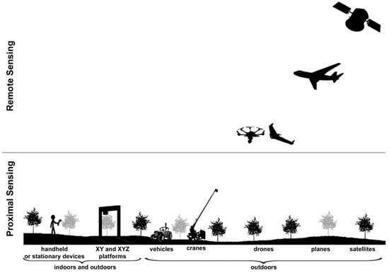 Thermography is extensively used for stress detection from lab to field scale by either proximal or remote sensing (Figure 1). On one hand, proximal sensing (mainly in growth chambers and greenhouses) refers to imaging single leaves or entire plants from a close distance to the target. The camera could be mounted on a static stand or small and medium-size robots, including high-throughput platforms. On the other hand, remote sensing refers to measurements taken in open fields with imaging sensors implemented on a wide range of devices, such as cranes, vehicles, robots and unmanned aerial vehicles (UAVs; in which the image resolution depends on the flight height) to cover whole crop fields. Even larger areas (district to region scales) can be tackled thanks to the sensors onboard satellites (i.e. ASTER, Sentinel-3, ECOSTREES, or Landsat-7 and 8, among others). These sensors differ in their spatial resolution and also on the time resolution, depending on the revisiting frequency of the satellite over the particular area.
