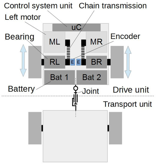 The mobile platform’s drive system comprises of two 24 V, 250 W direct current motors and an integrated gearbox of cylindrical type. An additional gear wheel is mounted on the motor shaft, which together whith the one on the drive shaft ensures a gear ratio of 1.12, allowing to increase the torque and reduce speed even more. The drive shaft is embedded in two bearings, which join it to the frame. Each wheel is driven separately by an individual DC motor. The position of the wheels is measured by an encoder mounted on their axle. On this basis, the distance traveled by the robot is determined (see Figure 1).