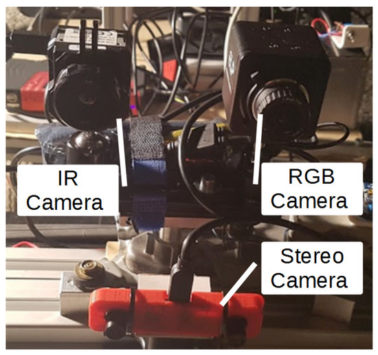 The detection module contains two vision sensors: one RGB video camera and one infrared thermomvision camera. The parameters of the RGB camera have been selected appropriately so the angle of view of both cameras is similar. Both devices were mounted on a rotating bracket, which, by performing a swing movement, allowed to acquire image in front of the robot and on both of its sides. Rotational speed has been smoothly adjusted with use of a dedicated module. In addition, in front of the vehicle a stereo-vision camera has been attached, which provided additional spatial information—depth estimation (see Figure 3).