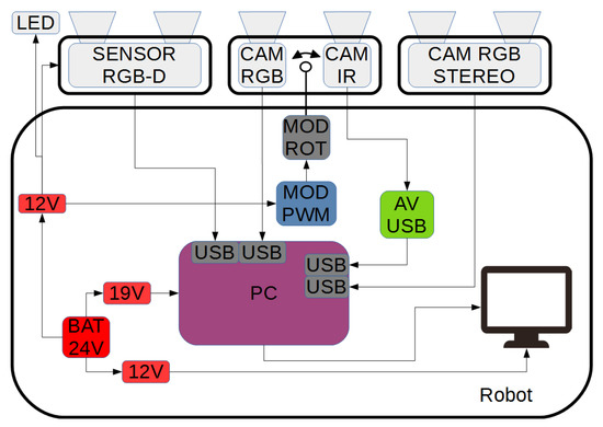 The area in front of the robot has been illuminated with 48 W led lamps connected to a stand located behind the cameras (Figure 4). There has been also an additional camera mounted on the mobile platform, which served for the observation of the surface in front of the vehicle. The vision data has been transmitted wirelessly to an external remote control panel. The block diagram of the sensory system, together with its power supply is shown in the Figure 5.