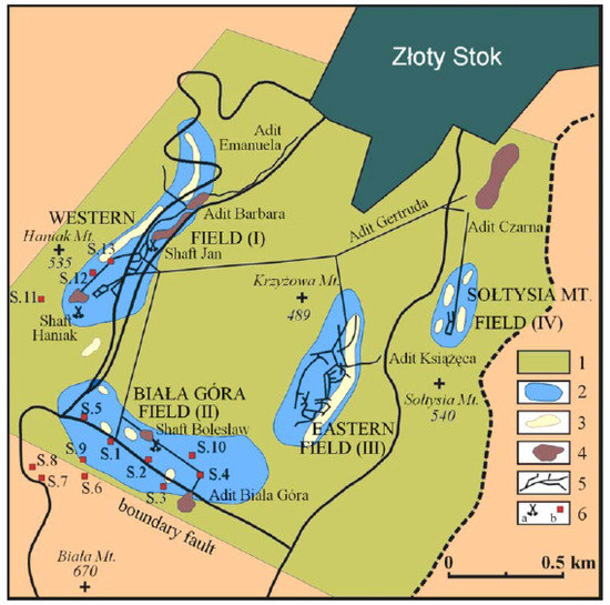 The rocks hosting the ore deposit are of polymethamorphic type with well-developed blastomylonythic series [39]. The exploitation of the ore has begun in the thirteenth century and lasted until the early 1960s of the twentieth century. It was the oldest Polish gold mine and a significant provider of arsenic oxide, which became its main product from the 18th century [38]. Many of the underground corridors, located in strongly cracked and deformed massive have been made manually and with use of explosives in the later years of exploitation. As mining activities developed, the exploitation of the ore concentrated in four mining fields: in the Western Field (I), at the bottom of the Mount Haniak, Biała Góra field (II)—most south from the Złoty Stok city, Góra Krzyżowa/Eastern field (III)—on the western hillsides of Złoty Jar valley and Góra Sołtysia field (IV)—east of the valley (See Figure 6).