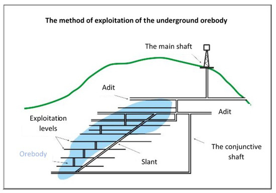 The orebody has been accessed gradually, from above, through a system of shafts and adits see Figure 7. In 1920, the two kilometer long Gertruda adit was built, that connected all the mining fields. During II World War, and in the period shortly after, the mine was closed, most of the adits and chambers were flooded and buried. Then, after about 30 years, some elements of infrastructure—including adits, have been made available for tourists. One of them is the above mentioned Gertruda, and the second is the so called Sztolnia Czarna (the Black Adit), the entrance to which is located in the upper part of Złoty Jar valley. It allows access into former exploitation chambers and is connected with a 300 m long underground corridor located at the lower level, having its exit near the Gertruda adit.