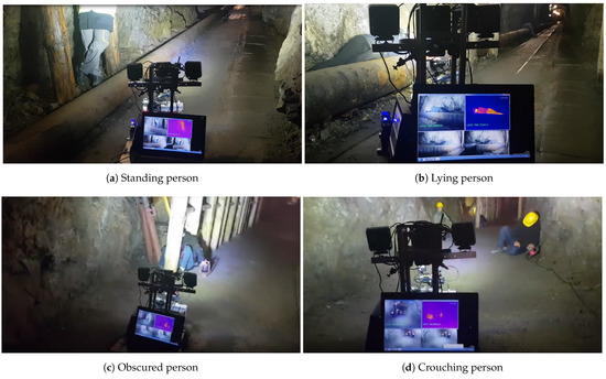 Since the underground mine’s environment is complex, rich in elements of wall and roof support, with the uneven surfaces of the corridors’ walls and other local changes in the excavations’ cross sections, distinguishing a human from the background is a challenging task. In an emergency situation, an injured or scared person is very likely not to be in a standing position and sometimes to be partially covered or hidden in a recess. Taking the above mentioned issues into consideration the experiment has covered multiple cases of human detection, including the ones with a non-obvious human-surrounding layout. The method of human detection has been tested on the following cases (Figure 8a–d). Results are presented in Section 6.