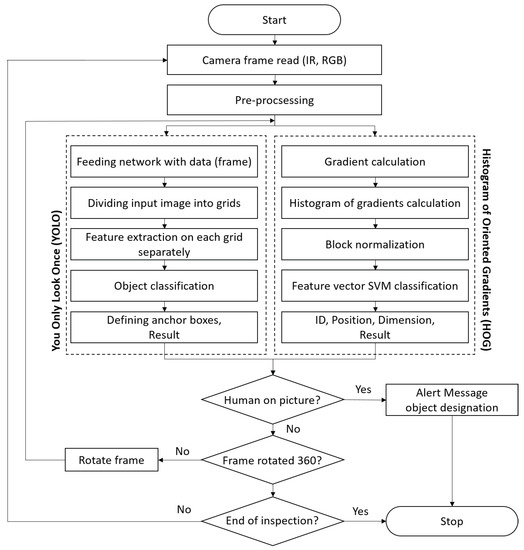 As the first step of the vision-based human recognition process, the Histogram of Oriented Gradients (HOG) feature descriptor has been employed, which is accessible from an OpenCV library [40]. The method involves computing of the gradient orientation in each section of the image divided by a dense grid of evenly distributed cells (detection windows/ROIs) [8]. HOG-based algorithms are used, among other for the pedestrian detection [41,42], including applications based on thermovision digital images [43]. The sequence of the operations to be performed in order to detect objects with use of HOG descriptor, is presented in the right dashed frame in the Figure 9. The image acquired by the camera can be subjected to preprocessing: normalization, brightness and contrast correction, or gamma correction. In the first phase of the experiment there was no preprocessing performed, to evaluate the performance of the algorithm on the raw data.