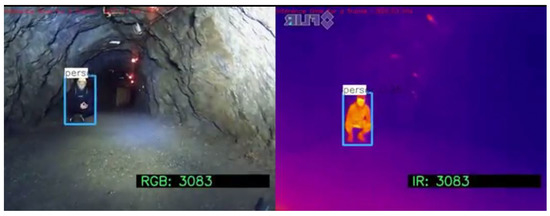 Figure 16. Human obscured—no detection in RGB image, correct detection in the IR image with algorithm YOLO.