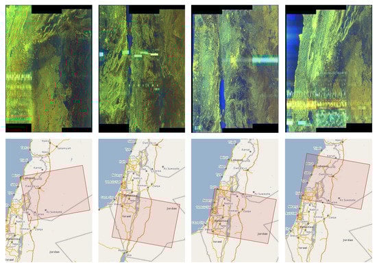The potential reason for the incoherent electromagnetic interference signals in the SAR images in the area surrounding Tel Aviv can be various radiation sources from the Sde Dov Airport, the Israel Defense Forces headquarters, and a large military base, as well as ships in the Mediterranean basin. In the case of broad-band RFI, many strong stripes with high intensity that produce irregular texture patterns and can be observed in many C-band Sentinel-1 SAR data acquired for this area are probably caused by simultaneous SAR imaging of the same area by both the Sentinel-1 and Canadian Radarsat-2 [,]. They both operate at the same center frequency of 5405 GHz [,].
