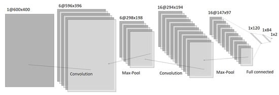 To verify the effectiveness of our artifact extraction method, we used a LeNet deep neural network [,,] defined in this section for classification. We used Python-related tools, such as PyTorch, TorchVision, and NumPy. The visualization of results was performed using Seaborn and Matplotlib. A transformation was made when loading images by scaling everything to 400 × 600 pixels to ensure the same size of the input for the network. The data were divided into training and testing sets in an 80/20 ratio in a random way. The network was fed with data after two alternating convolutional and maxpooling steps. We used three layers of neurons. The activation function of hidden layers was RELU; in the output layer we had raw values. The loss function took the form of categorical cross-entropy; thus, it can be higher than one. While the neural network learned, we used three data streams: R, G, and B. The Adam optimizer [] was used. The training was done over 20 epochs. The batch size was 50 and the learning rate was 0.001. The layers used in our model can be seen in Figure 5.